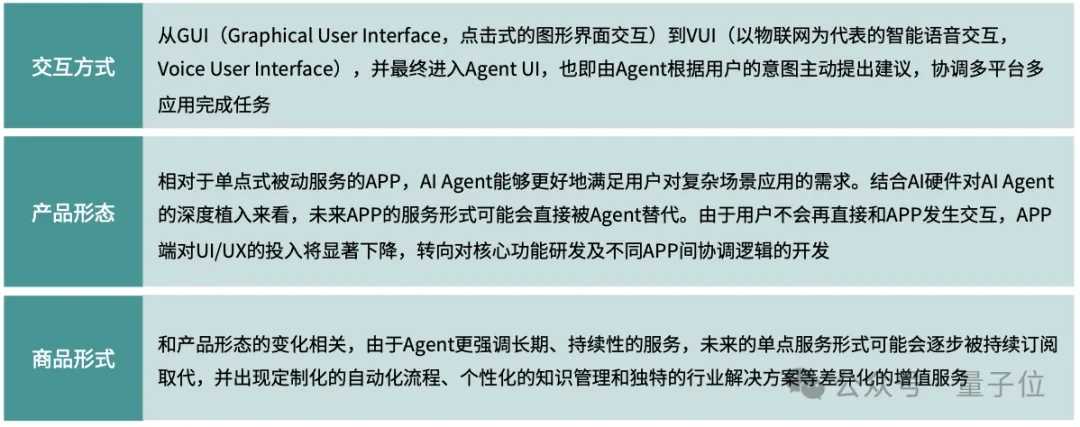 从技术和配套设施两⽅⾯发展来看,从2025年开始,AI Agent即将⼴泛投⼊使⽤。量⼦位智库认为,AI Agent有望带来独属于AI 2.0时代的交互⽅式、产品形态和商业模式。